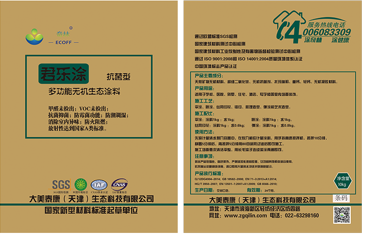 君樂涂-抗菌型:無機多功能生態涂料1.甲醛未檢出;VOC未檢出;2.抗菌抑菌;防霉菌功能;3.防潮調濕;消除室內異味;4. 防火阻燃;5.放射性達到國家A類標準。凈含量:10kg